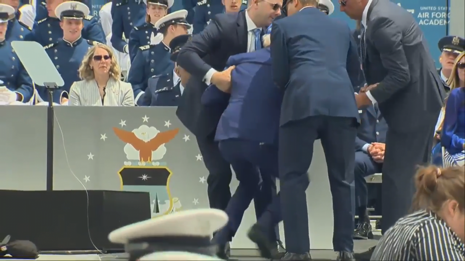 جو بایدن رییس جمهور ایالات متحده روز پنجشنبه در جریان مراسم آغاز به کار در آکادمی نیروی هوایی ایالات متحده ناگهان به زمین خورد.کاخ سفید روز پنجشنبه اعلام کرد که رئیسجمهور از روی کیسه شن لغزید و در اثر سقوط آسیبی ندید.بایدن در اوایل امروز سخنرانی آغاز به کار آکادمی نیروی هوایی را ایراد می
