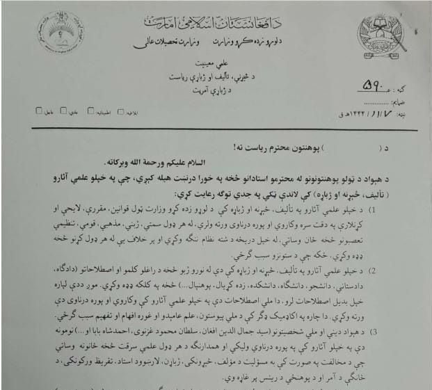 تالبان درنامه ای به تازه گی دستور داده اند تا کسی در نوشته هایش از واژه گان دانشگاه، دانشجو، دادگاه،دادستان، دانشجو ودیگر کلمات فارسی ازاین دست استفاده نکند. درنامه ای که به امضای حمیدالله مزمل رییس تالیف وترجمه وزارت عالی عنوانی دانشگاه ها ومراکز علمی سراسر افغانستان صادر شده آمده است که از کاربرد این