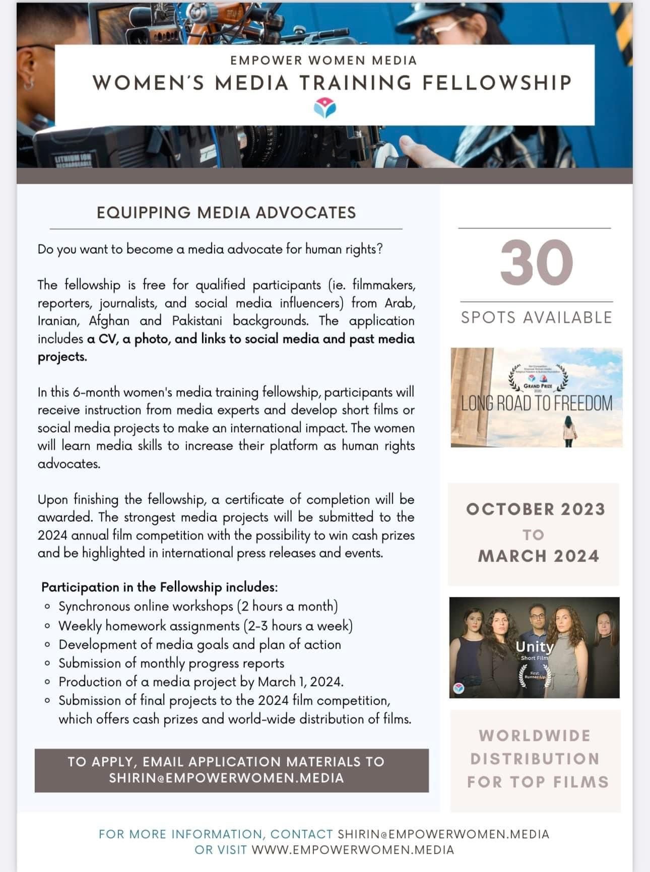 نهاد آمریکایی تقویت زنان در آمریکا یک دورهء آموزشی رقابتی برای زنان ازجمله زنان روزنامه نگار، فیلم ساز و فعال رسانه های اجتماعی برگزار می کند. شرکت کننده گان می توانند زنان کشورهای مختلف از جمله افغانستان باشند وپس از انتخاب در دوره های آموزشی دراین زمینه ها تحت پوشش قرار خواهند گرفت.برعلاوه تامین هزینه