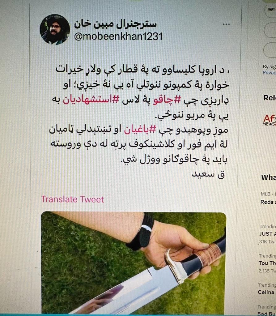 جنرال مبین از چهره های برجسته رسانه ای طالبان با پست عکس یک کارد گفته است که خیرات خورانی که در صف کلیسا در اروپا ایستاده اند وفراریان جمهوریت درکمپ های آواره گان؛همگی باید کشته شوند. او افزوده که جوانان زیادی هستند که حملات استشهادی علیه مخالفان طالبان در غرب انجام دهندو آن هارا به
