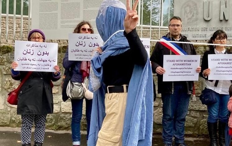 شماری از زنان افغانستان وفرانسه در پاریس با اجرایی نمایشی خیابانی به موضوع طرح به رسمیت پذیرفته شدن طالبان منحیث حکومت افغانستان واکنش نشان داده اند. این زنان دراین حرکت زن برقع پوشی را به نمایش گذاشته اند که توسط طالبان به بند کشیده شده است. شبنم سلحشور از اشتراک کننده گان همایش ودختری که این نقش را اجراکرده است، به فارسی تایمز گفت که ما زنان ودختران افغانستان با تمام توان تلاش می کنیم تا به دنیا بگوییم که زنان افغانستان حق زنده گی وکار وتحصیل دارند وجهان نباید به چنین حکومتی که زنان را اززندگی اجتماعی حذف کرده است،اجازه بدهد تا این استبداد ادامه پیدا کند. گفتنی است این زنان دراین همایش به سخنان اخیر امینه محمد معاون دبیر کل سازمان ملل متحد نسبت به افغانستان واکنش نشان داده وگفته اند که به منظور اعتراض ومخالفت با این سخنان وطرح بحث به رسمیت پذیری طالبان این همایش را شکل داده اند .