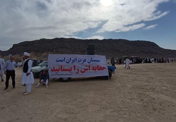 مردم در جریان تشکیل زنجیره انسانی و تجمع خواستار پیگیری کمیساریای آب ایران و وزارتخانههای نیرو و امورخارجه نسبت به حقآبه رودخانه هیرمند طبق معاهده ۱۳۵۱، حقآبه زیست محیطی تالاب بینالمللی هامون، اصلاح سامانه انحرافی بند “کمال خان” کشور افغانستان و جلوگیری از تکمیل سد “بخش آباد” روی “فراه رود” افغانستان شدند.