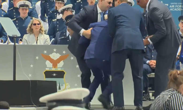 جو بایدن رییس جمهور ایالات متحده روز پنجشنبه در جریان مراسم آغاز به کار در آکادمی نیروی هوایی ایالات متحده ناگهان به زمین خورد.کاخ سفید روز پنجشنبه اعلام کرد که رئیسجمهور از روی کیسه شن لغزید و در اثر سقوط آسیبی ندید.بایدن در اوایل امروز سخنرانی آغاز به کار آکادمی نیروی هوایی را ایراد می کرد.